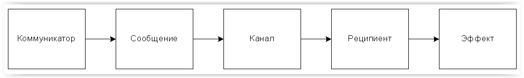 Модель Лассуэла является первой в ряду других моделей коммуникации. В ней отражается интерес исследователей, в первую очередь, к результату коммуникации. Как сообщение, передаваемое коммуникатором, влияет на реципиента. Естественно, в этом случае коммуникация рассматривается как односторонний процесс. Модель не учитывает ни внешнюю среду, ни внутренние установки коммуникантов. Основное внимание исследователя сосредоточено на эффекте коммуникации: сообщение -> результат.